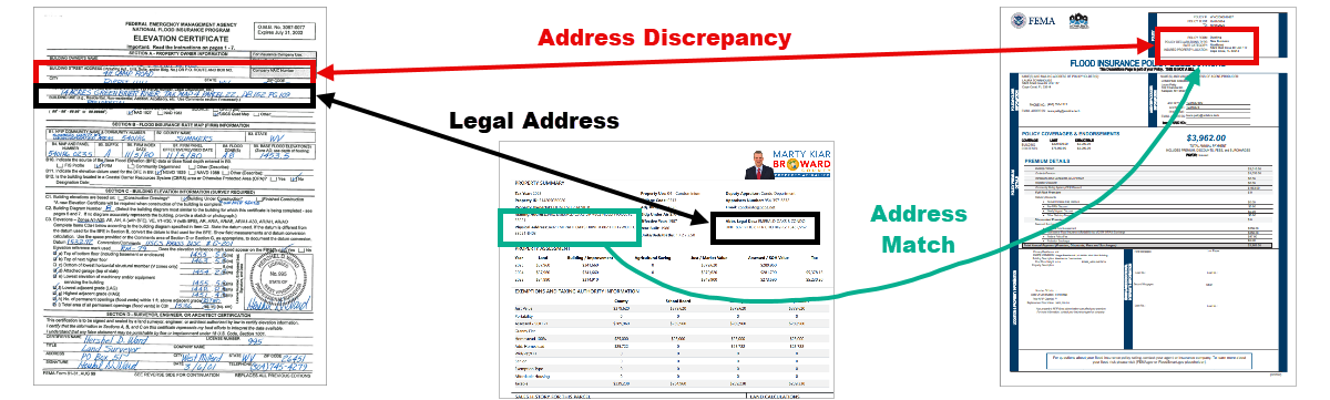 In the image above, the property address mismatch on the Elevation Certificate can be resolved by matching the legal address on the EC to the Property Card, which shows the same property address as the policy.