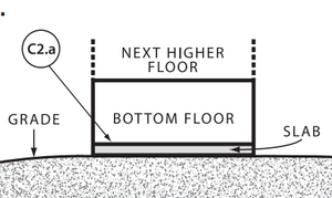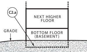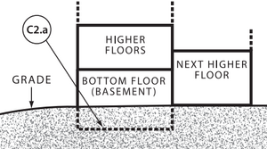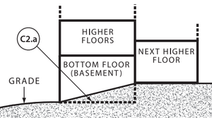 |The bottom floor is below ground level (grade) on all sides. The basement level measures more than five feet to the floor above it. | |The bottom floor is below ground level (grade) on all sides. The basement level measures more than five feet to the floor above it. | ||