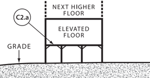 |The area below the elevated floor is open, with no obstruction to the flow of floodwaters. Open lattice and insect screening is permissible. "Pier and beam" foundations. | |The area below the elevated floor is open, with no obstruction to the flow of floodwaters. Open lattice and insect screening is permissible. "Pier and beam" foundations. | ||