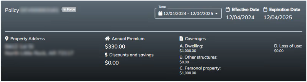 • Shows details like property address, premiums, discounts, and coverages (dwelling, personal property, etc.).